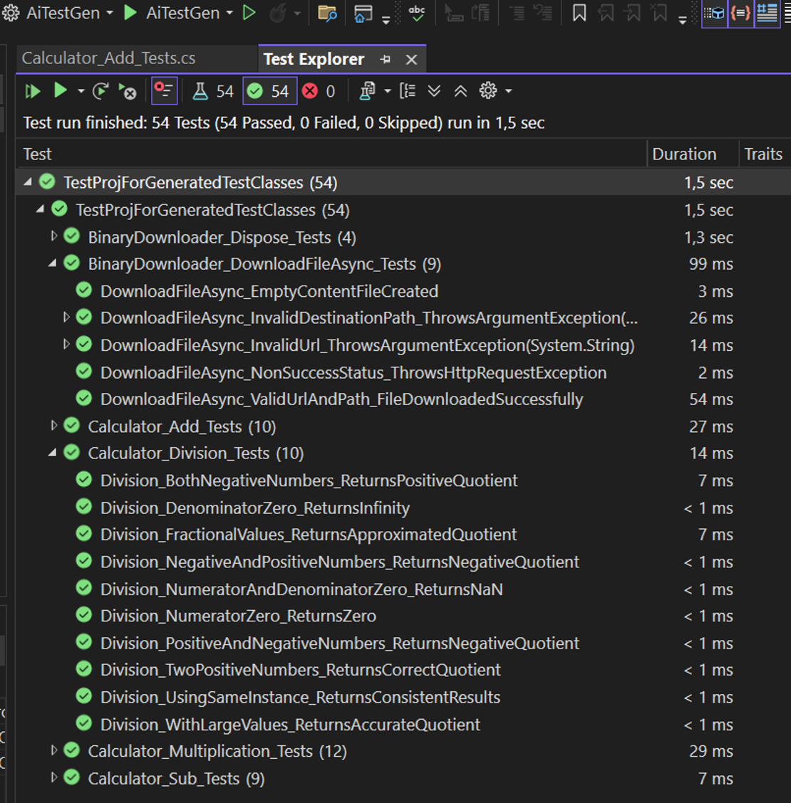 As you may notice, all the test classes in the Test Project TestProjForGeneratedTestClasses have been created automatically from the AI. When executing our console app the created test classes will be placed within the GeneratedTests folder within the bin folder of our console app.