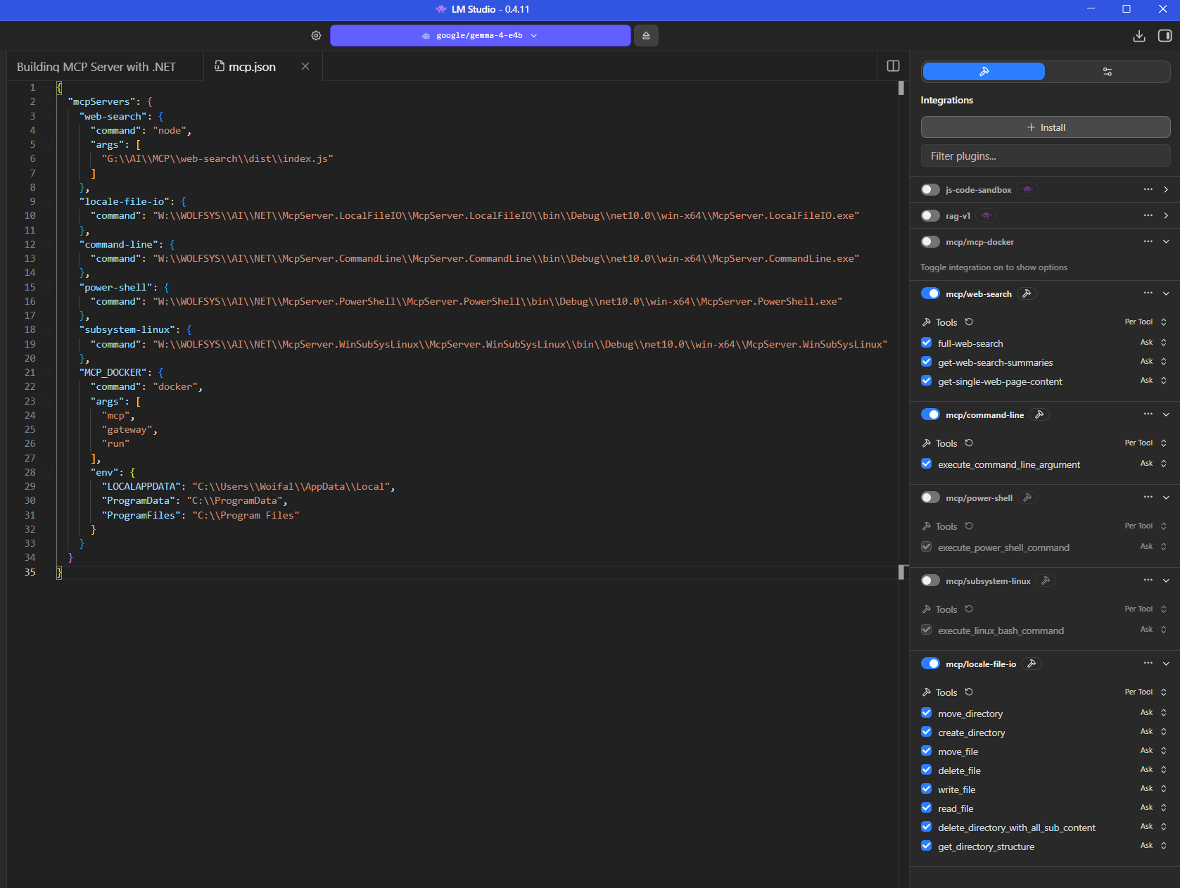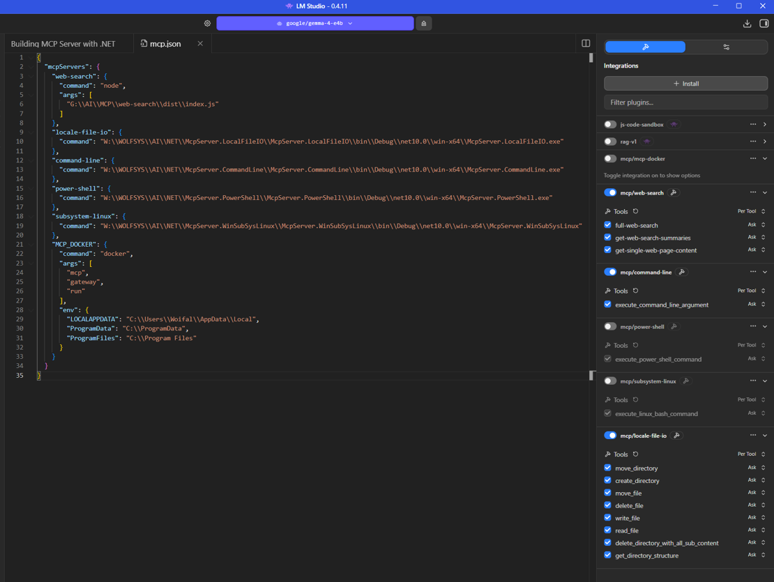 For LM Studio, which is a Desktop Client, you do not need to configure MCPO since a Desktop Client does understand stdio quite well. Simply add the .NET executeables to your mcp.json file like: