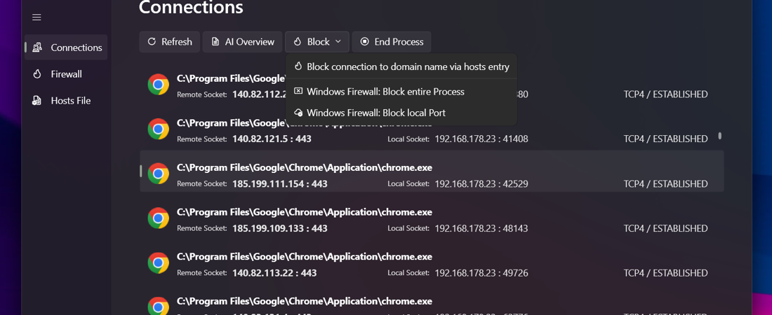 Whether you're a power user, developer, gamer, or security-minded professional, ConnectionMgr lets you take action the moment you see something suspicious. Block unwanted connections with a single click: