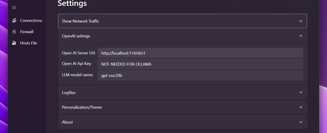 But the real magic comes from built-in AI assistance. Simply add your OpenAI-compatible API credentials and unlock instant, intelligent insights about any connection: suspicious hosts, unknown processes, unusual traffic patterns, and more. Use the OpenAI API and talk directly to ChatGPT or even local running LLMs like f.e. Ollama or LM Studio, or any LLM that is OpenAI compatible! With AI at your side, even complex network activity becomes easy to understand.