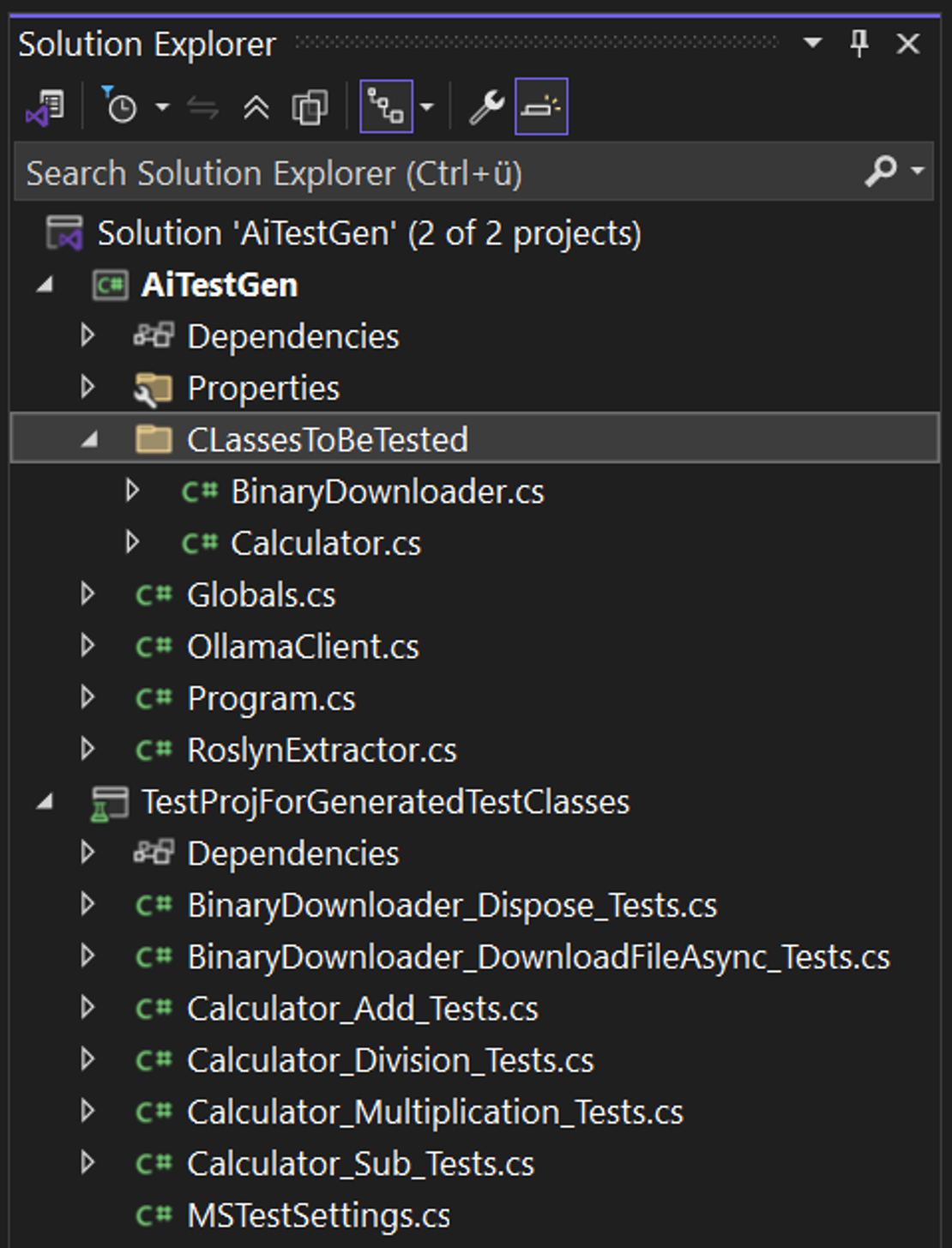 As you may notice, all the test classes in the Test Project TestProjForGeneratedTestClasses have been created automatically from the AI. When executing our console app the created test classes will be placed within the GeneratedTests folder within the bin folder of our console app.