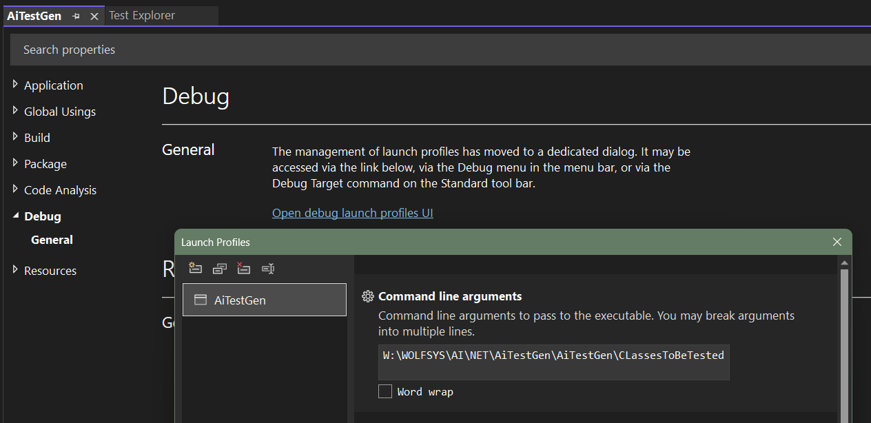 We need to pass the folder containing all the C# classes that require test methods as a command‑line argument to our console app. To help while devoloping, you can set this argument via Project Properties / Debug / Open debug launch profiles UI so you simply can fire up F5 and don't run into an argument exception: