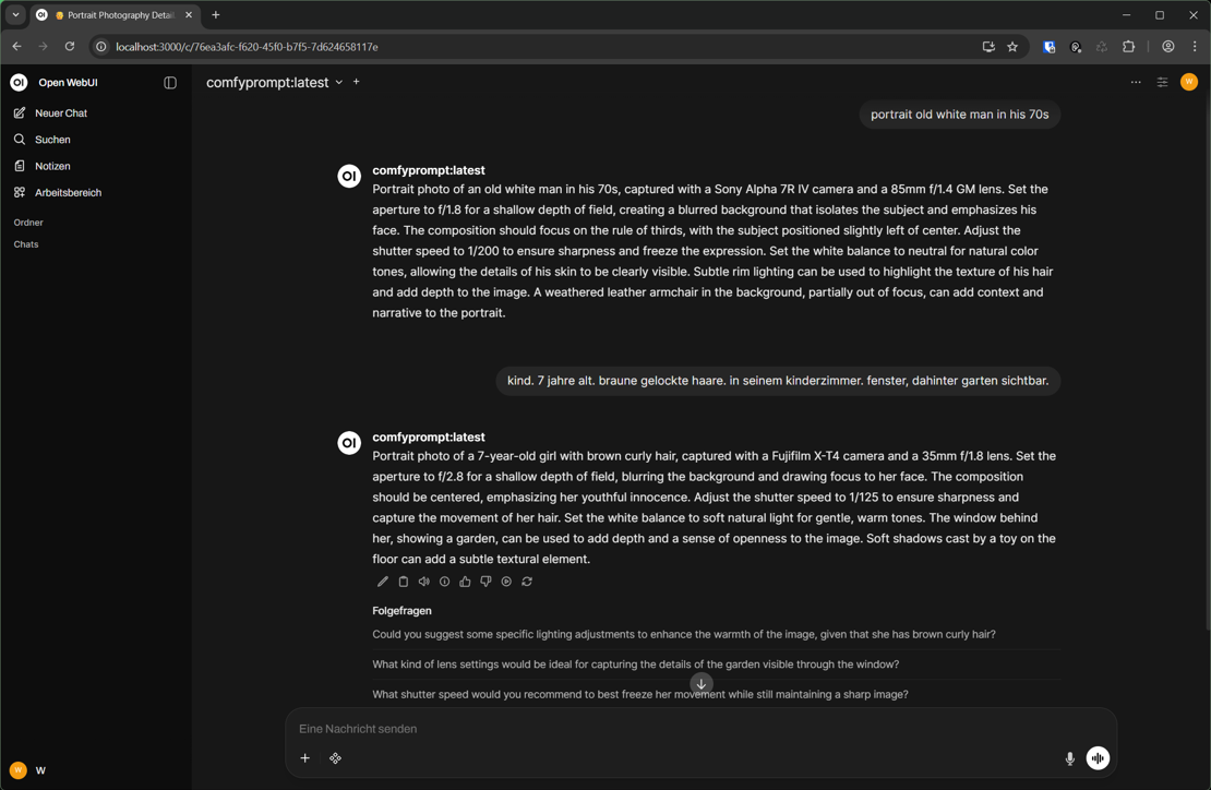 and our customized model "comfyprompt" will generate the prompts according to our specified template in the system prompt. Since we told the model to always answer in english regardless of the language used in the user prompt, the response for the german prompt of course is in english: